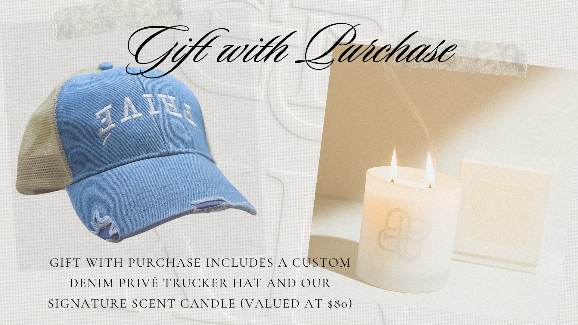 As a special thank-you during our annual open house, the first 75 guests to spend $500 or more will receive an exclusive Privé gift with purchase – featuring our custom Privé hat and signature scent candle.